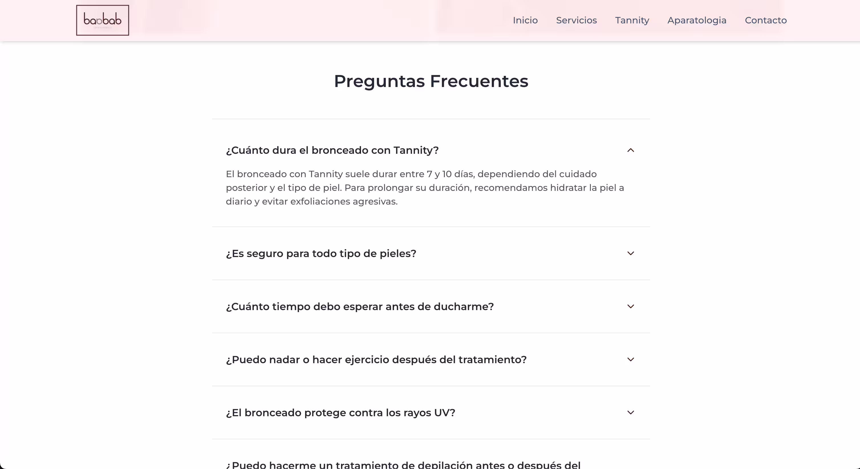 Arquitectura de contenidos centrada en servicios (medicina estética, depilación, tratamientos faciales/corporales, manicura y pedicura), con secciones específicas para cada servicio individual. Mensajes claros, llamadas a la acción visibles (reservar cita / solicitar información) y microcopy que reduce fricción.