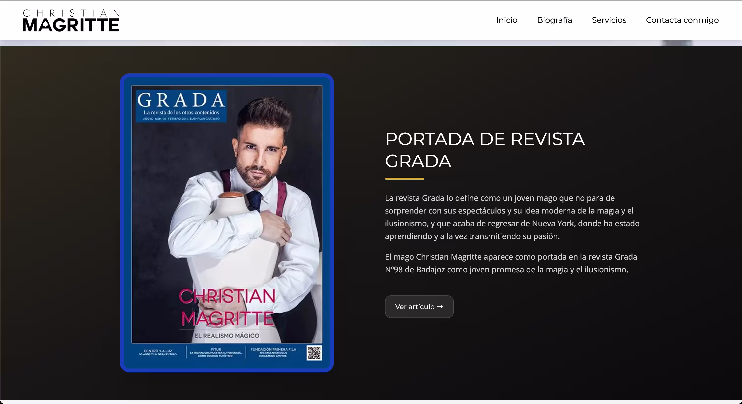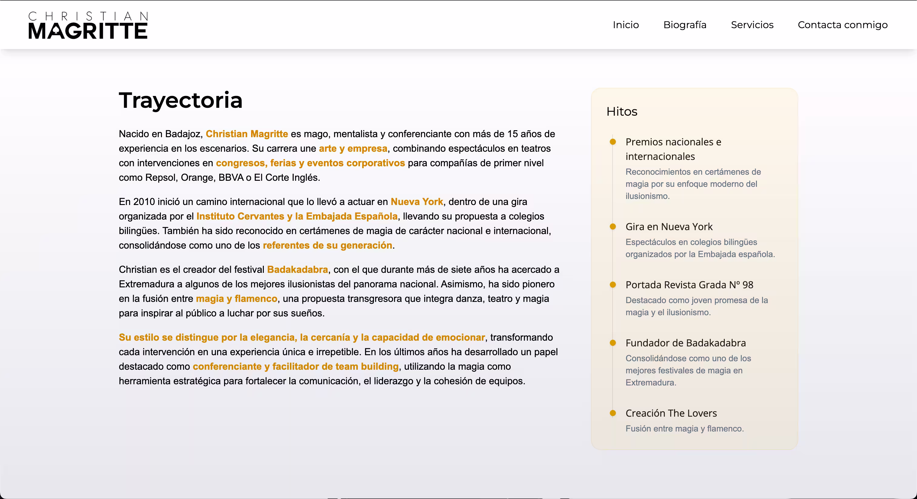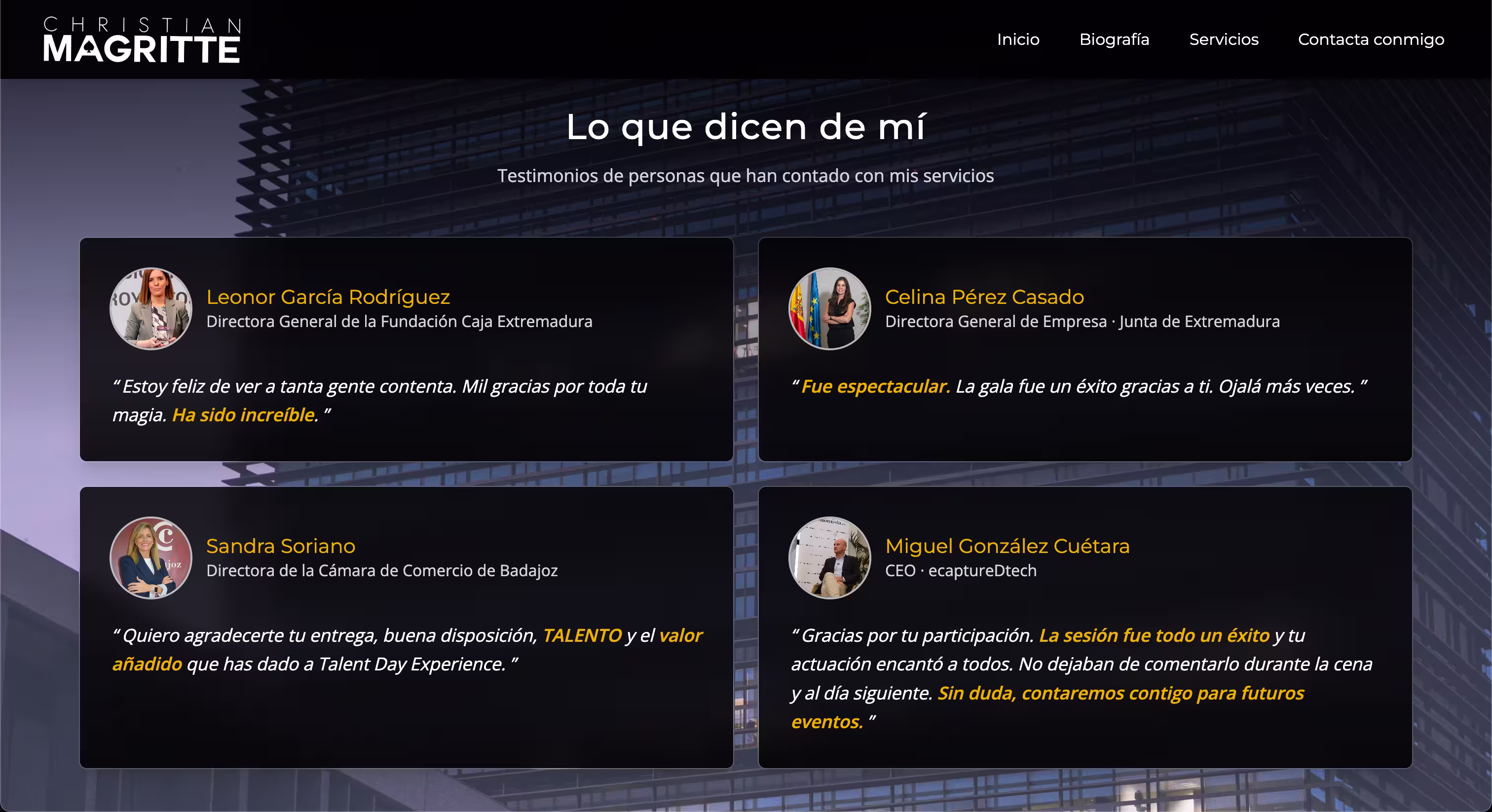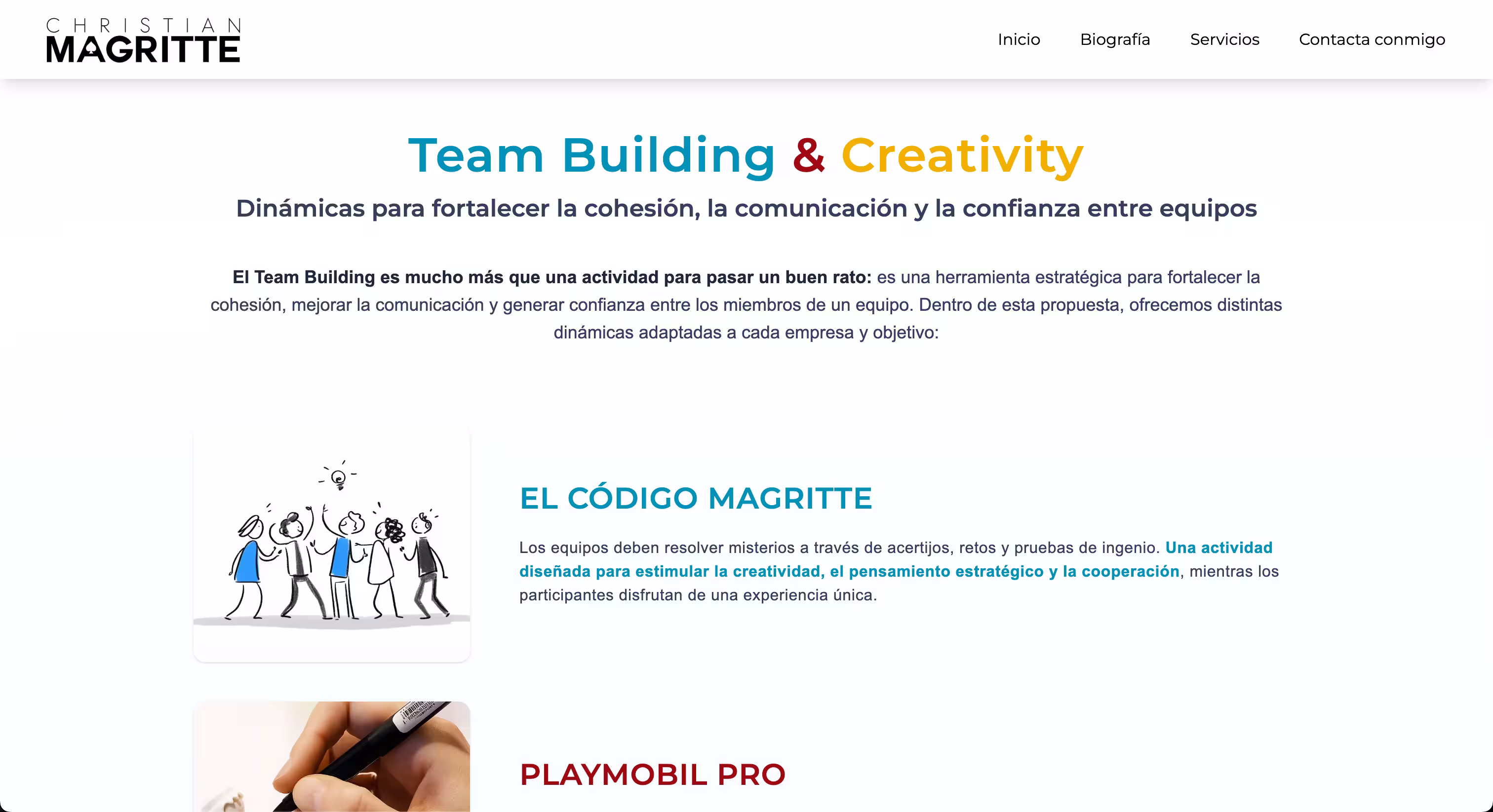 Diseño y desarrollo de la landing de Christian Magritte, una solución 100% adaptada a los requerimientos del cliente. El objetivo era claro: captar leads cualificados en el ámbito B2B (business to business), es decir, empresas que buscan presentadores, espectáculos de magia o actividades de team buildingpara sus eventos corporativos.
